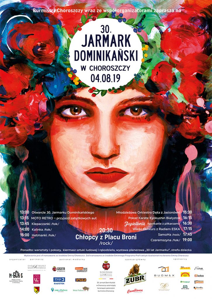 Blisko 15 hektarów przestrzeni, 130 stoisk do dyspozycji, już od 10.00 nieprzerwane atrakcje w Parku Pałacowym Letniej Rezydencji Branickich: dla dzieci, młodzieży, dorosłych, całych rodzin i grup przyjaciół, strefa dziecka, pokaz garncarstwa i tkactwa najwyższej próby, aktywna scena muzyczna folkowo-rockowa z królową folku – „Czeremszyną” oraz gwiazdą rocka – „Chłopcami z Placu Broni”, a ponadto zacni goście z Jagiellonii i karatecy z Karate Kyokushin Białystok. Oprócz tego: szlachetne wozy retro i jeszcze: lody, napoje, ciepłe przekąski, sztuka ludowa i rękodzieło… O ludzie! Jak to unieść? Nie martw się, po prostu bądź w Choroszczy 4 sierpnia! Te atrakcje – jak najpiękniejsze kwiaty w dorodnym wianku – przygotowała specjalnie dla Ciebie Gmina Choroszcz z okazji jubileuszowego XXX Jarmarku Dominikańskiego! Zawitaj w Choroszczy 4 sierpnia i poznaj wianek przebogatych atrakcji!