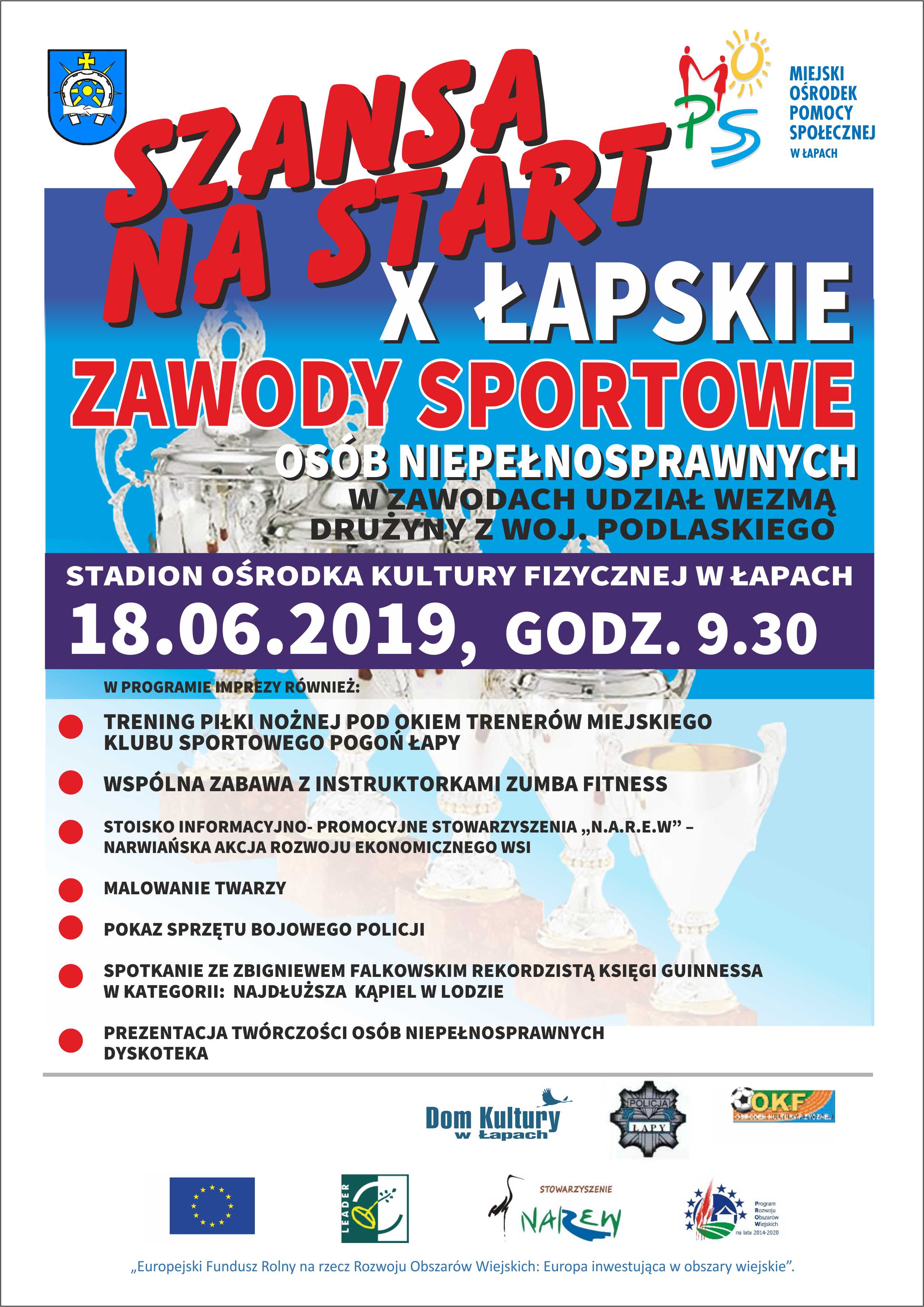 Stowarzyszenie N.A.R.E.W. – Narwiańska Akcja Rozwoju Ekonomicznego Wsi jako współorganizator X Łapskich Zawodów Sportowych Osób Niepełnosprawnych „Szansa na Start” zaprasza mieszkańców gmin należących do Stowarzyszenia do wzięcia udziału w zmaganiach sportowych.