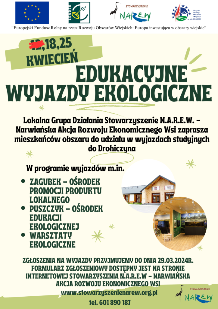 Zapraszamy mieszkańców obszaru LGD N.A.R.E.W. do udziału w Edukacyjnych wyjazdach ekologicznych do Drohiczyna. Warsztaty realizowane są w ramach projektu „Gospodarka o obiegu zamkniętym sposobem na ochronę środowiska i przeciwdziałanie zmianom klimatu”.