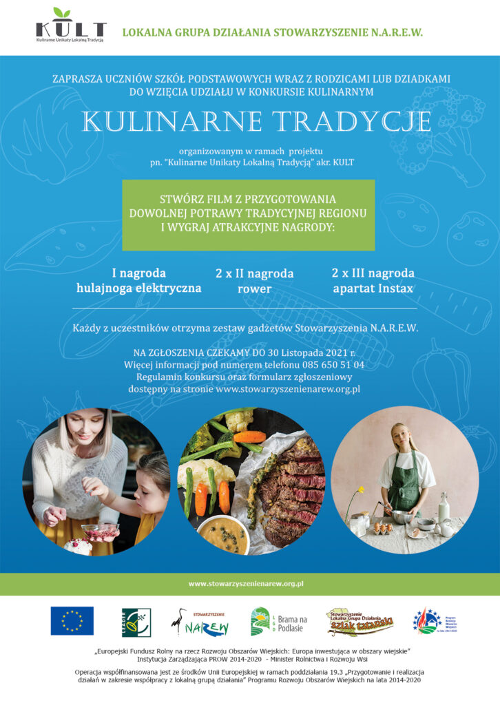 Stowarzyszenie N.A.R.E.W. – Narwiańska Akcja Rozwoju Ekonomicznego Wsi, Zaprasza wszystkich uczniów szkół podstawowych z obszaru działania LGD N.A.R.E.W. do udziału w konkursie pod nazwą „Kulinarne Tradycje”.