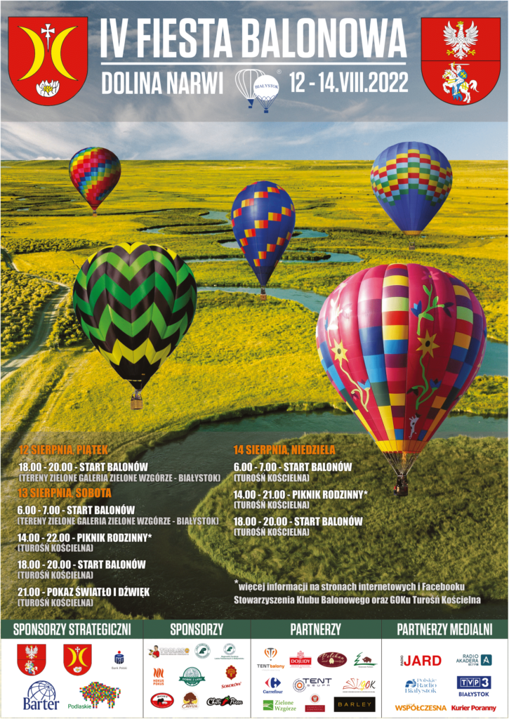 Serdecznie zapraszamy w niedzielę 14 sierpnia 2022 r. do Turośni Kościelnej (plac przy stadionie gminnym w Turośni Kościelnej) na IV Fiestę Balonową, organizowaną przez Gminę Turośń Kościelna, Stowarzyszenie „Białostocki Klub Balonowy” i GOK w Turośni Kościelnej. Podczas imprezy, w namiocie LGD Stowarzyszenia N.A.R.E.W. od godziny 14.00 do godziny 17.00 będzie można uzyskać informacje o założeniach i realizacji Lokalnej Strategii Rozwoju LGD Stowarzyszenie N.A.R.E.W. – Narwiańska Akcja Rozwoju Ekonomicznego Wsi.