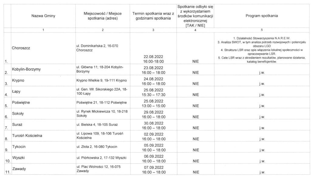 Stowarzyszenie N.A.R.E.W. – Narwiańska Akcja Rozwoju Ekonomicznego Wsi przygotowuje się do organizacji konsultacji społecznych. Konsultacje te obejmują co najmniej jedno spotkanie na obszarze każdej z gmin planowanej do objęcia LSR poświęcone w szczególności analizie mocnych i słabych stron, szans i zagrożeń, a także celów LSR i będą odbywać się