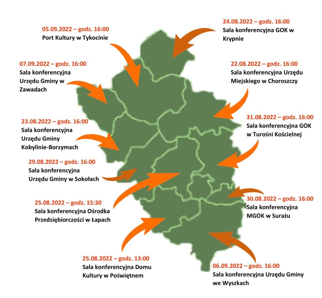 Na spotkania zapraszamy: mieszkańców gmin z obszaru naszego LGD (Choroszcz, Kobylin-Borzymy, Krypno, Łapy, Poświętne, Sokoły, Suraż, Turośń Kościelna, Tykocin, Wyszki i Zawady), lokalnych liderów, przedstawicieli jednostek samorządu terytorialnego, ośrodków kultury, ośrodków pomocy społecznej, stowarzyszeń, fundacji, Kół Gospodyń Wiejskich, Ochotniczych Straży Pożarnych, lokalnych przedsiębiorców i wszystkich zainteresowanych przyszłością i rozwojem naszego obszaru.