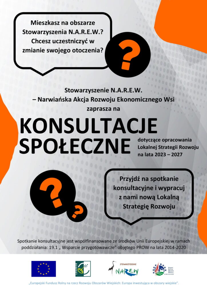 Stowarzyszenie N.A.R.E.W. – Narwiańska Akcja Rozwoju Ekonomicznego Wsi serdecznie zaprasza do udziału w spotkaniach konsultacyjnych, dotyczących tworzenia Lokalnej Strategii Rozwoju na lata 2021-2027 (LSR), wyznaczającej kierunki wsparcia w nowej perspektywie finansowej.
