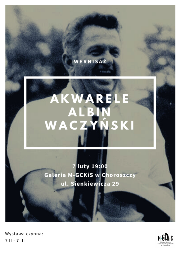 Zapraszamy wszystkich bardzo serdecznie na wernisaż wystawy obrazów Albina Waczyńskiego, który odbędzie się 7.02.2020 r. o godz. 19:00 w galerii Miejsko-Gminnego Centrum Kultury i Sportu w Choroszczy, wystawa będzie czynna w terminie 7 II – 7 III